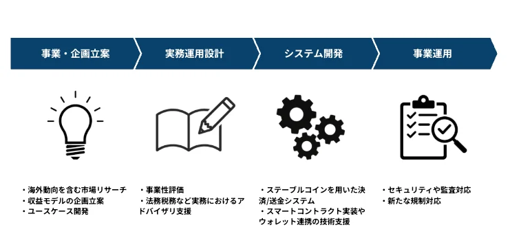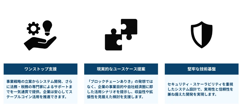 事業戦略の立案からシステム開発、さらに法務・税務の専門家によるサポートまでを一気通貫で提供。企業は安心してステーブルコイン活用を推進できます。
