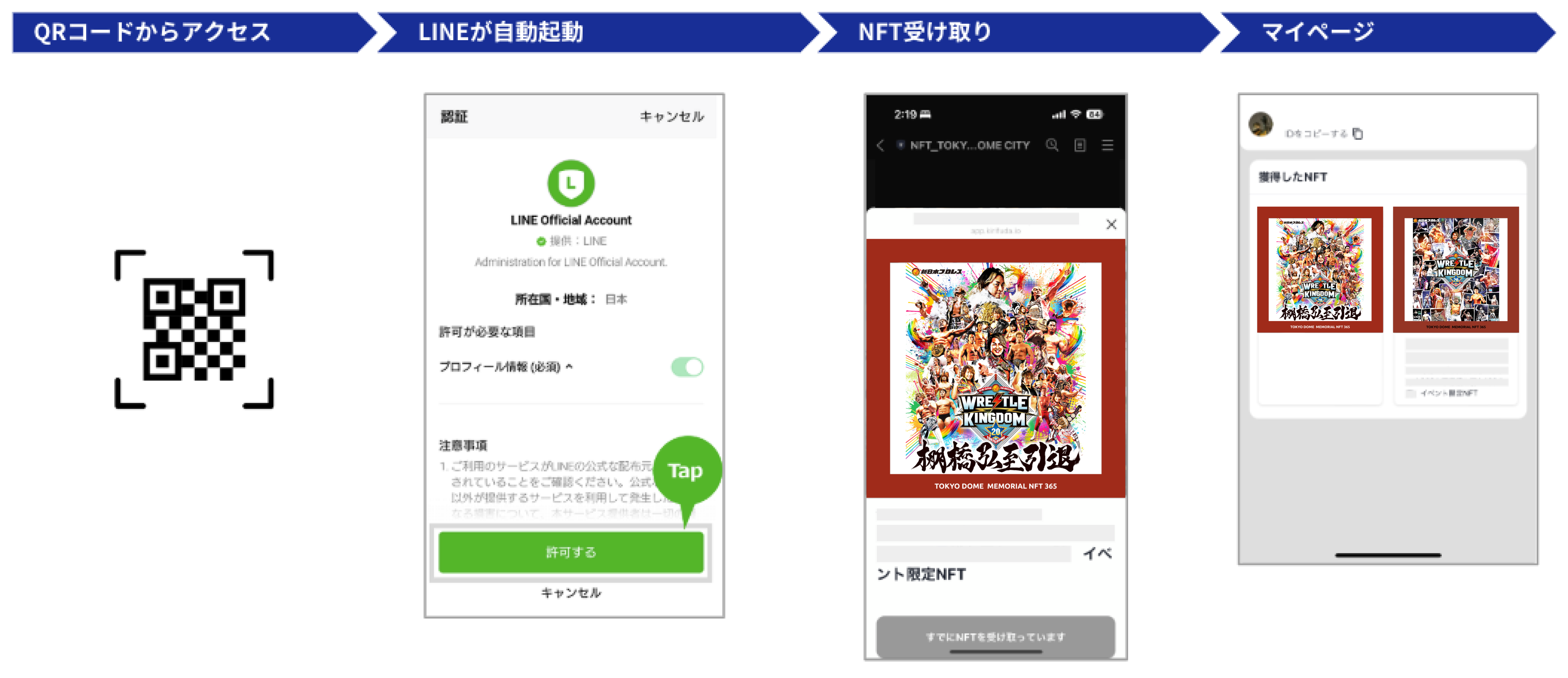 本イベントでは、来場者限定の記念NFTを配布いたしました。来場者は東京ドームシティ内に掲示された構内ポスター(22ゲート周辺)およびポスターのQRコード(*1)を読み取り、LINE上で簡単にNFTを受け取り、その保有状況を確認することが可能です。GPS機能により東京ドームシティ内でのみ受け取り可能な仕組みを採用し、来場者限定の特別な体験を実現しました。この仕組みにより、NFTの利用が初めての方でもスムーズに体験できる環境を実現しました。