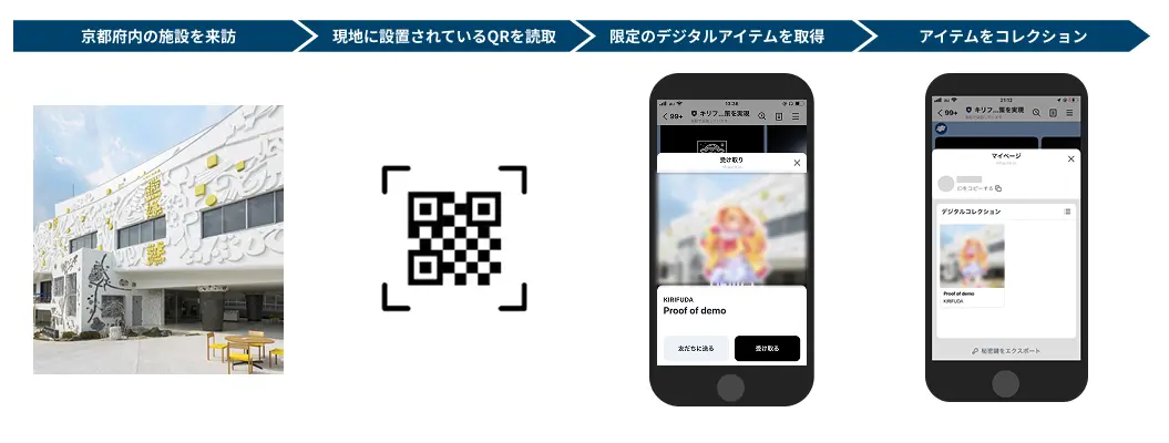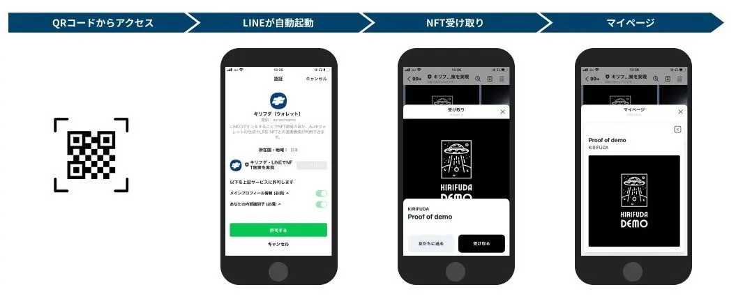 本事業においては、多くのユーザーが簡単にNFTを利用することができるように、キリフダ株式会社が提供するLINEで完結するNFTサービス「キリフダ」が導入されています。